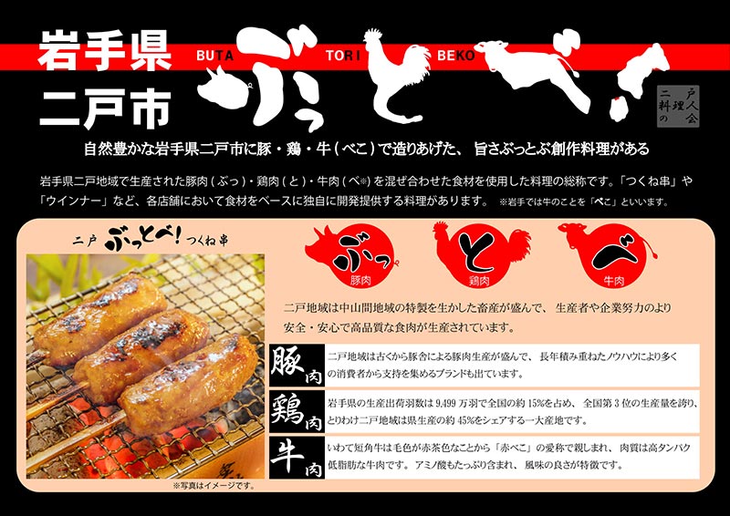 岩手県二戸地域で生産された『豚肉(ぶっ)・鶏肉(と)・牛肉(べ)』を使った「つくね串」です。